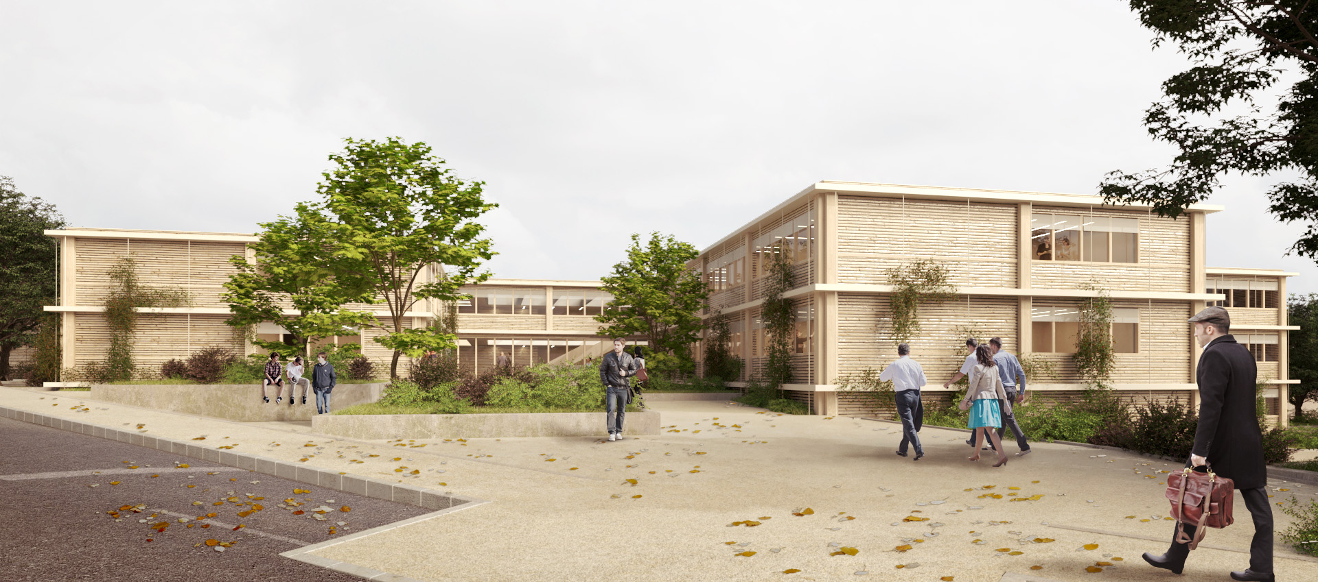 Im Realisierungswettbewerb zur Gallus-Schule im hessischen Grünberg ist unser Entwurf mit dem 2. Preis ausgezeichnet worden. Die Gallus-Schule ist eine Förderschule mit ganztägigem Angebot. Mit unseren drei zwei- bis dreigeschossigen Lernhäusern in Holzhybrid- oder Holzmassivbauweise haben wir uns auf die natürliche Umgebung bezogen. Für die Fassade sollten einheimische Hölzer wie Lärche verwendet werden.