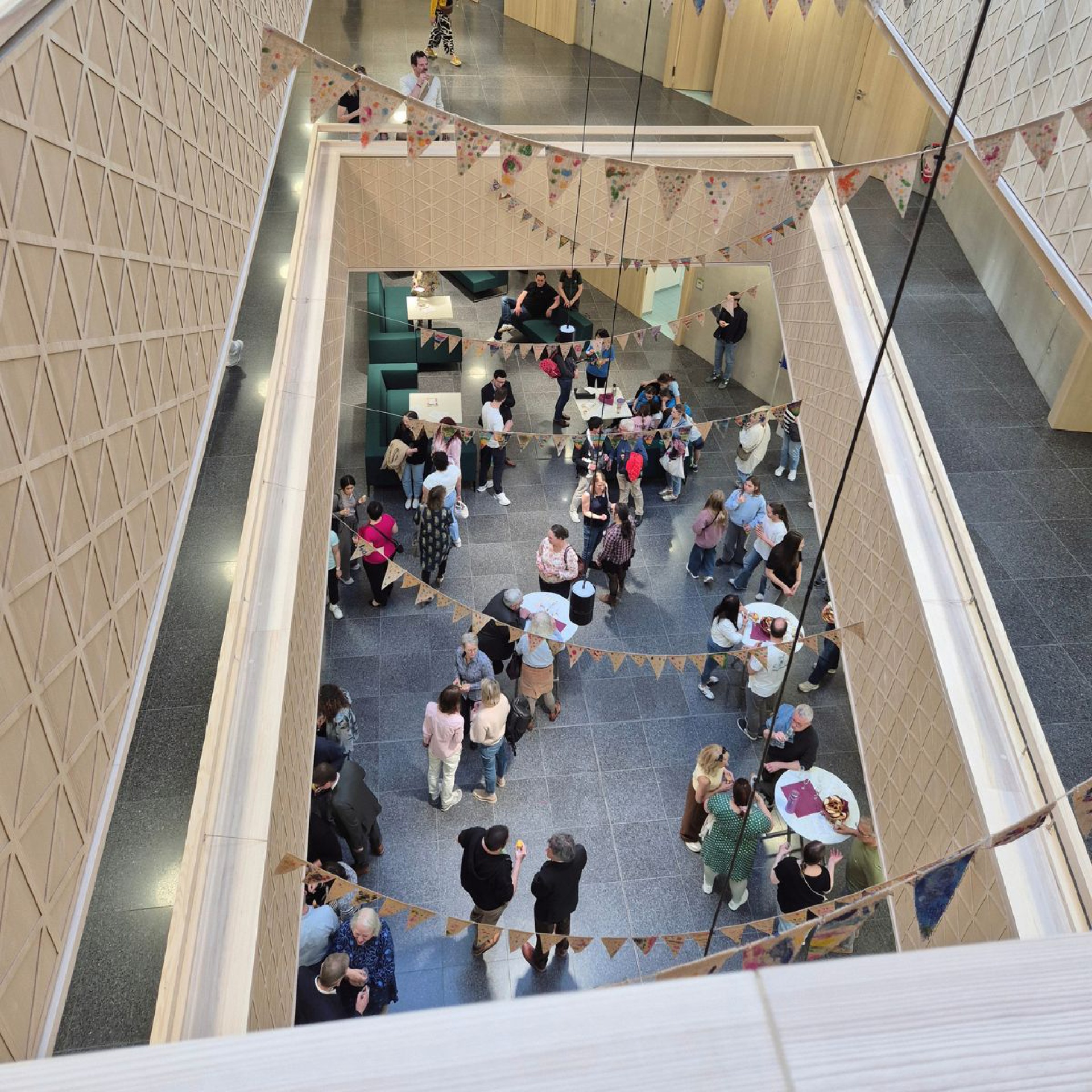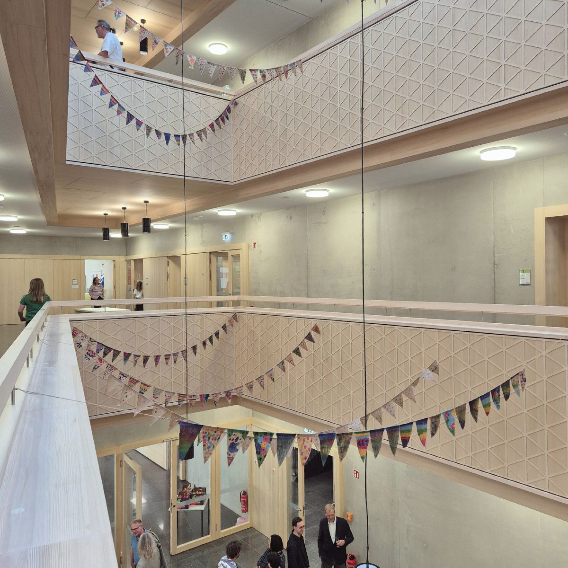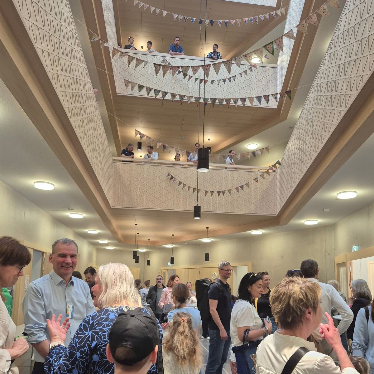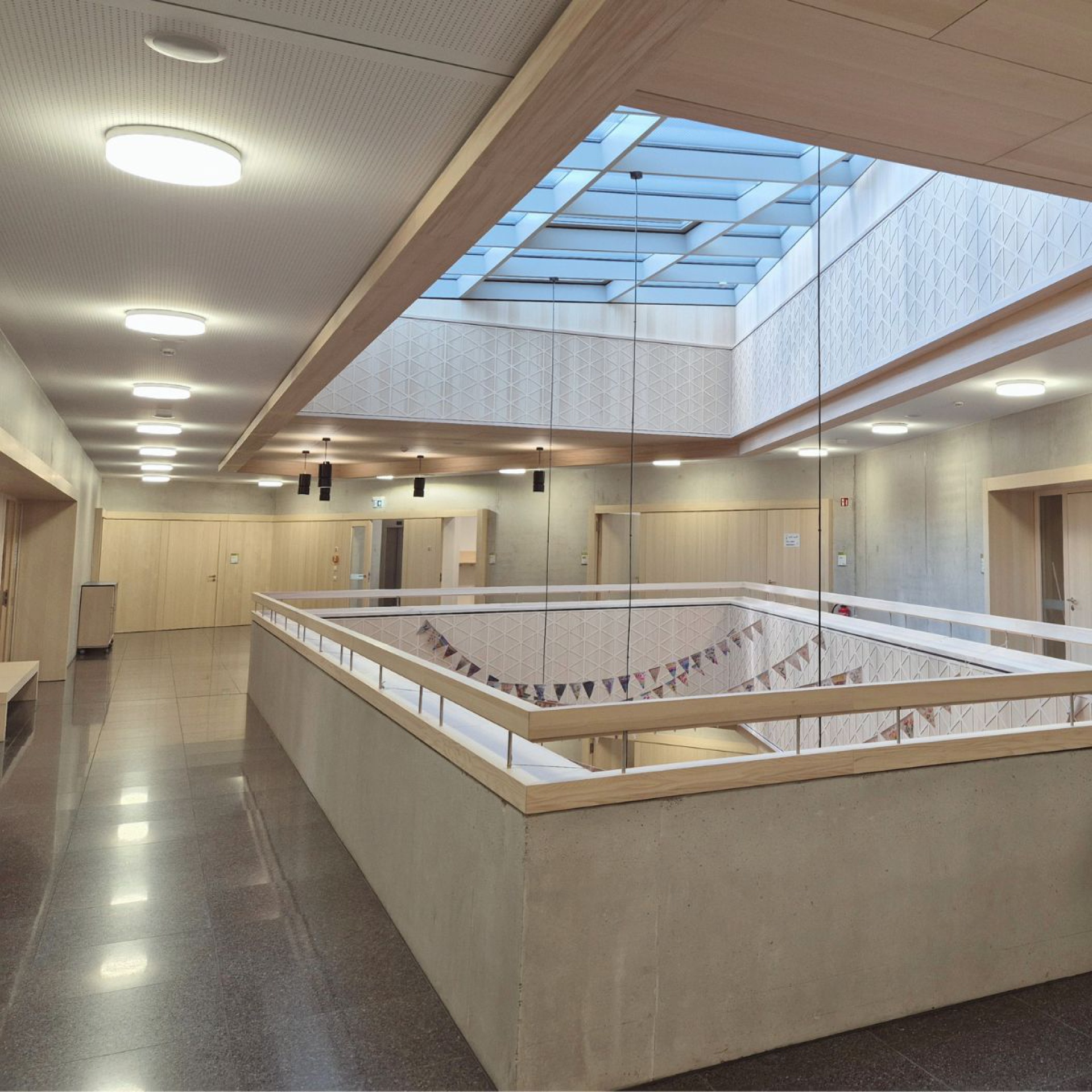 Zentrales Element ist das Atrium als räumlicher Mittelpunkt. Die umlaufende Holzbrüstung greift handwerkliche Motive auf und verleiht dem Raum Identität.