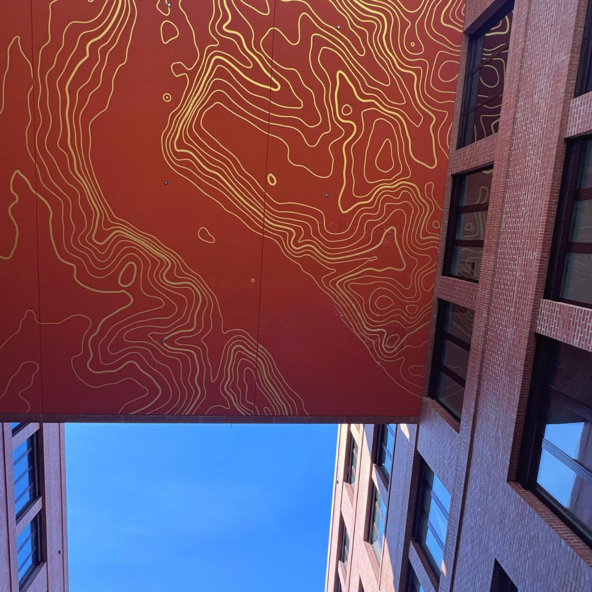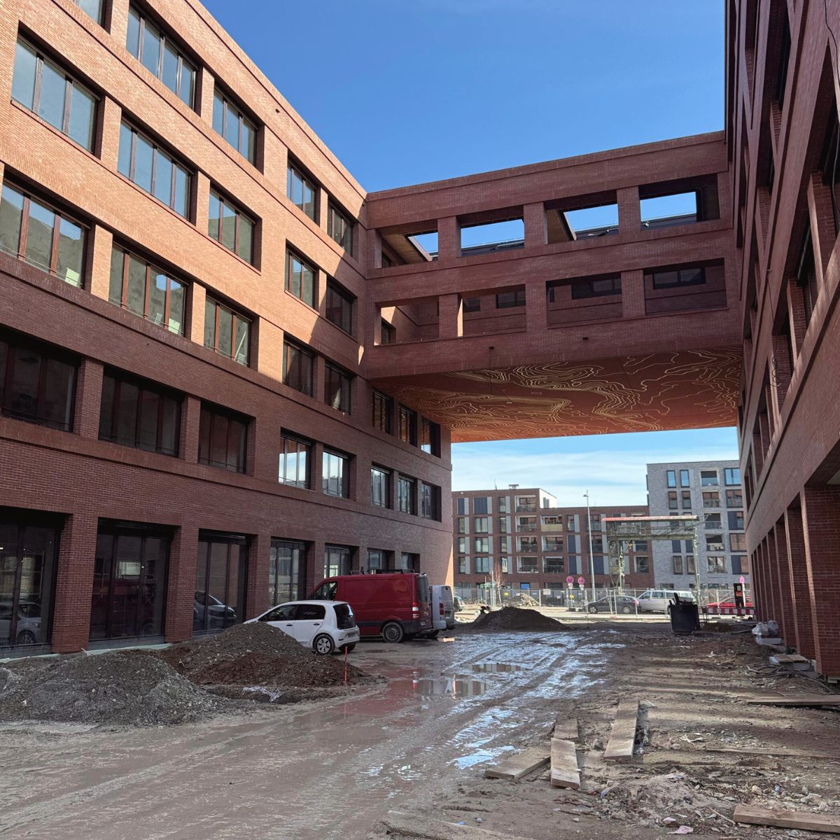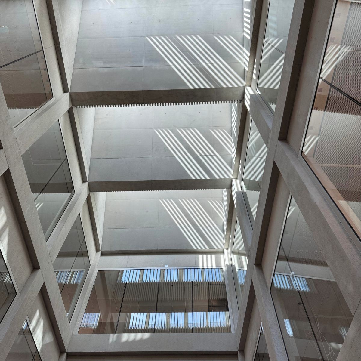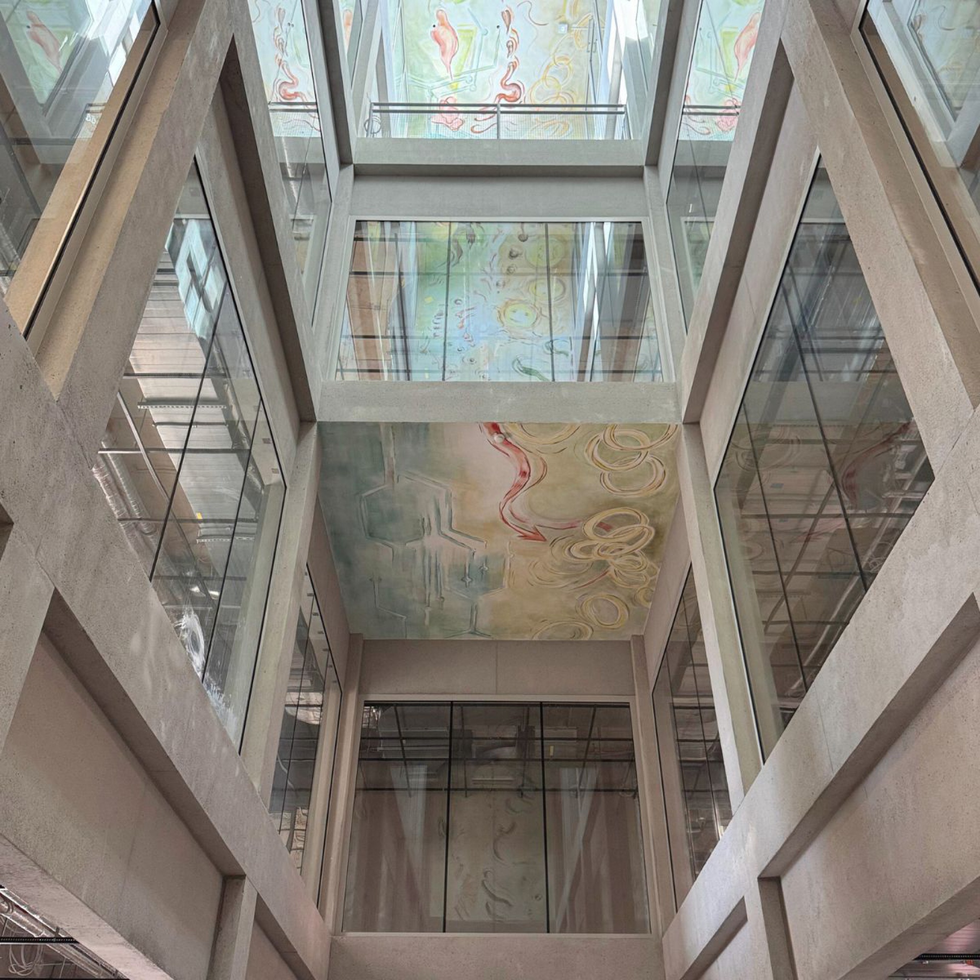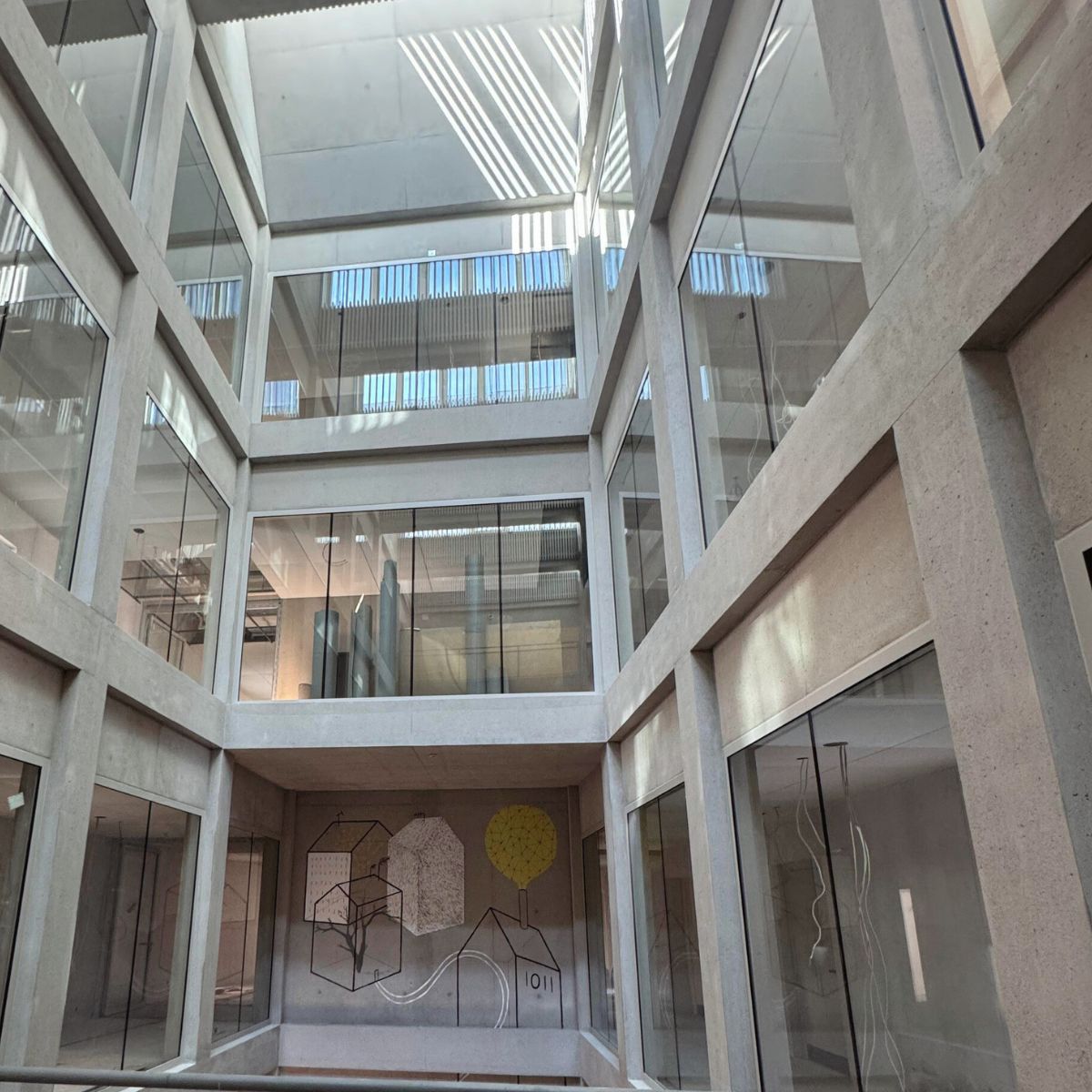 Im Inneren bildet ein über alle fünf Geschosse reichendes Atrium das Herzstück des Gebäudes. Es verbindet die Ebenen visuell und funktional und sorgt für Orientierung, Tageslicht und Begegnung. Das großformatige Wand- und Deckenfresko von Sonja Alhäuser ist von allen Etagen aus erlebbar und verleiht dem Raum eine identitätsstiftende, künstlerische Präsenz.