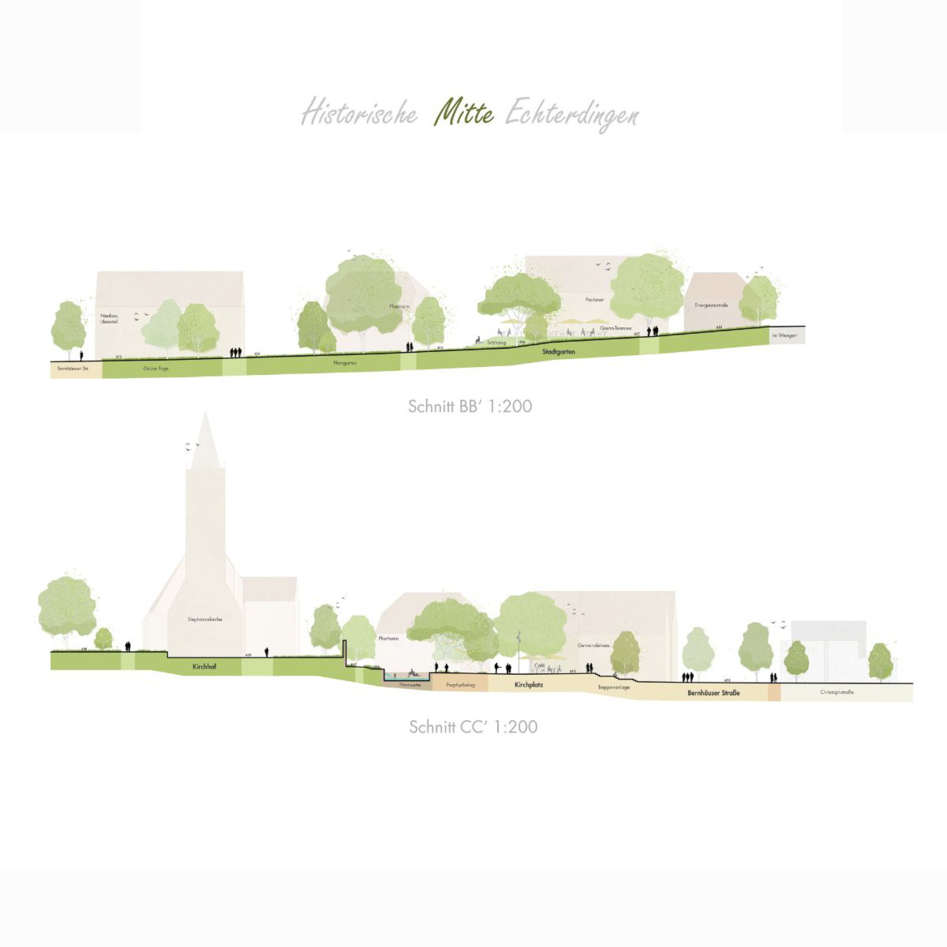 Im Realisierungsteil Freianlagen sollten insbesondere die Bernhäuser Straße, der Echterdinger „Kirchplatz“ mit Burgstraße Süd sowie der neue Echterdinger Stadtgarten als zusammenhängende, barrierefreie und identitätsstiftende öffentliche Räume mit hoher Aufenthaltsqualität entwickelt werden. Dabei standen Verkehrsberuhigung, Klimaanpassung, nachhaltige Materialien und die Stärkung des historischen Ensembles im Fokus.