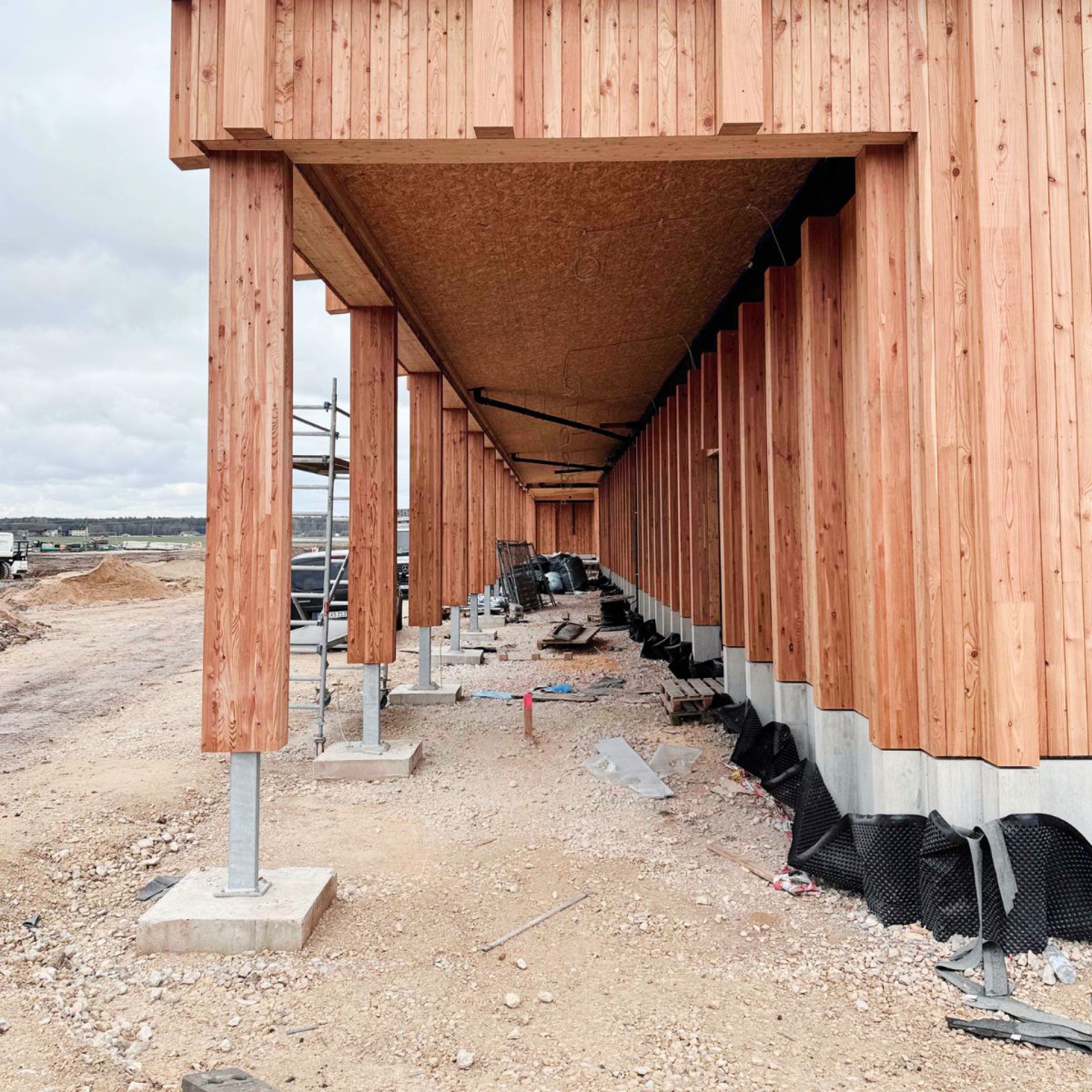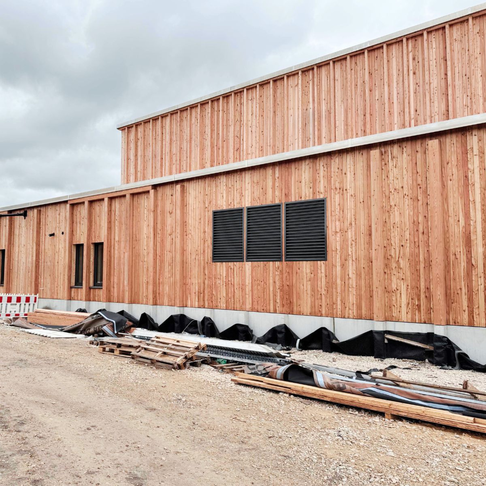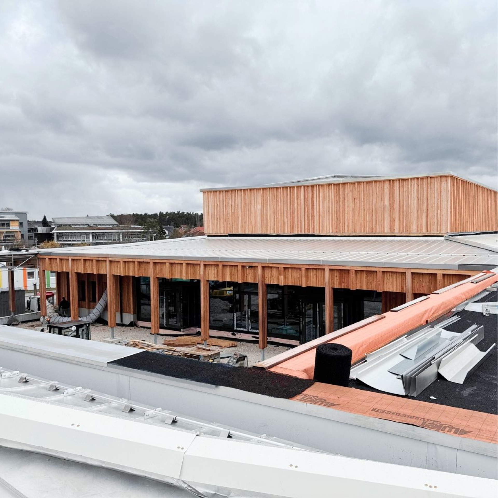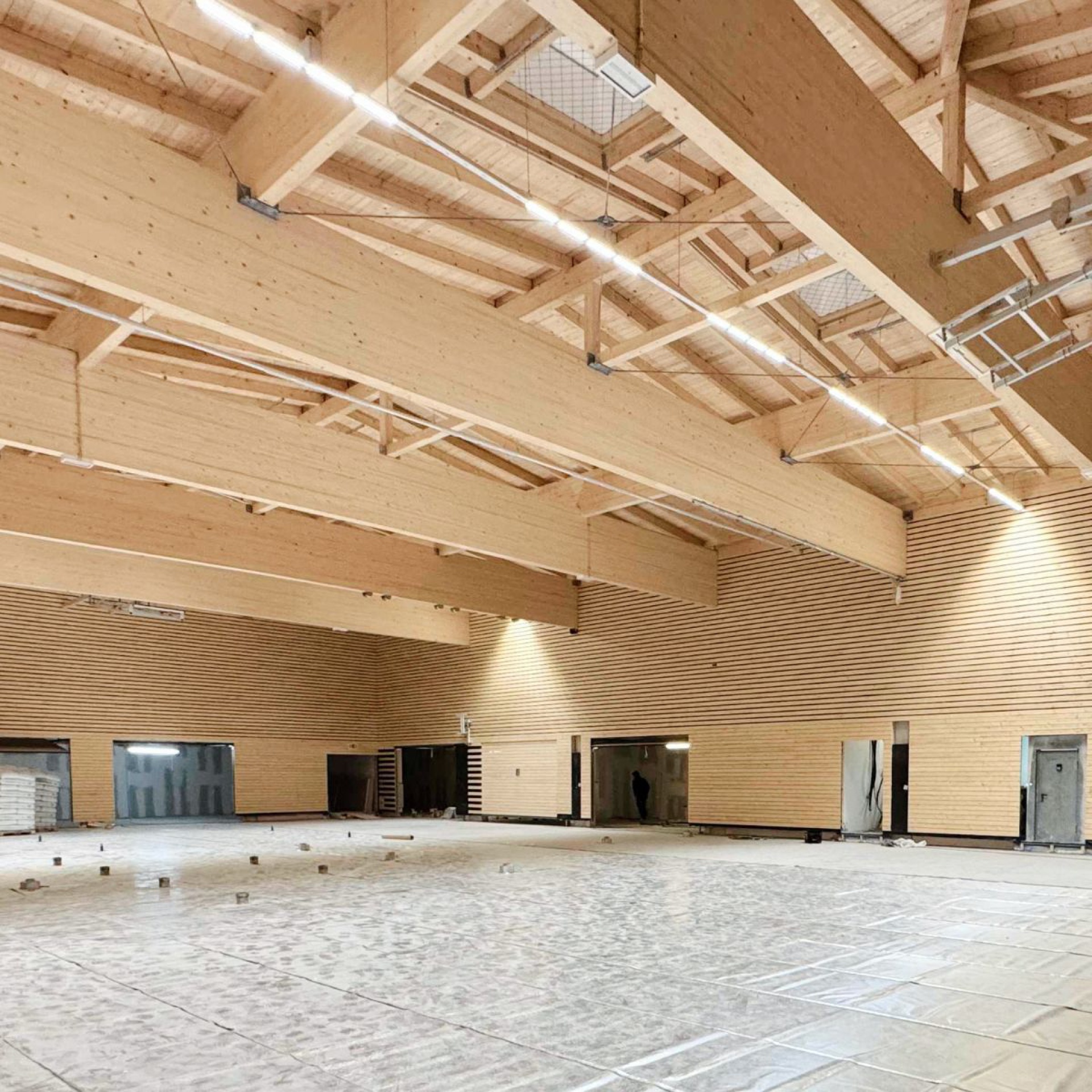 Projektstand März 2026. Der Neubau entsteht in Holzhybridbauweise und vereint Sport und Veranstaltungen unter einem Dach – mit zwei getrennt nutzbaren Bereichen. Die Fertigstellung ist für Sommer 2026 geplant.